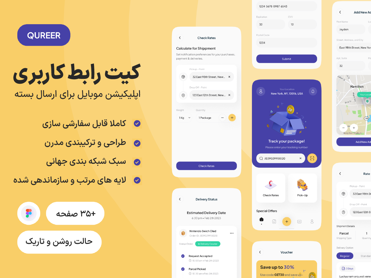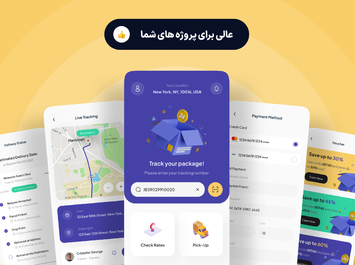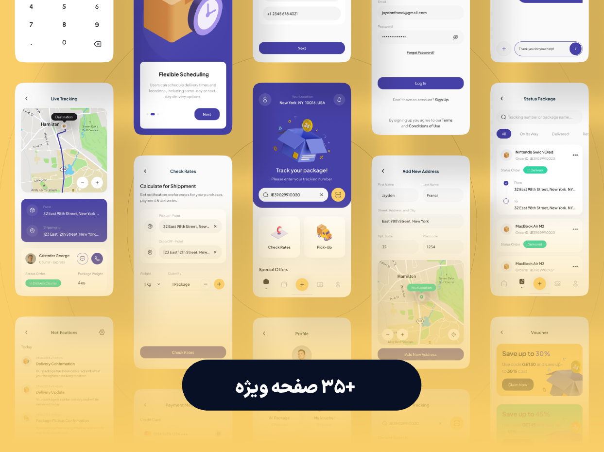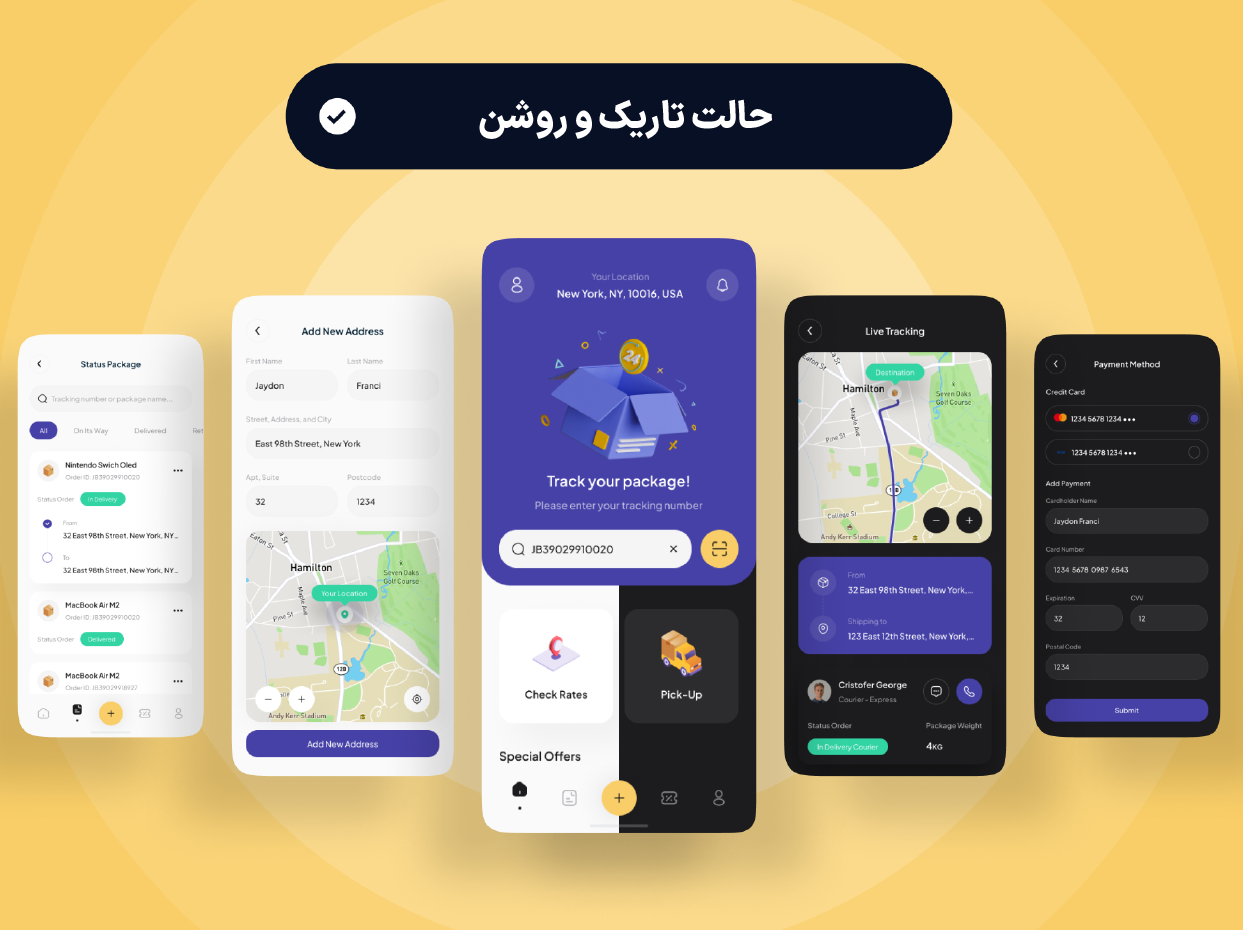 رابط کاربری اپلیکیشن موبایل تحویل بسته با سبک مدرن و مینیمالیست